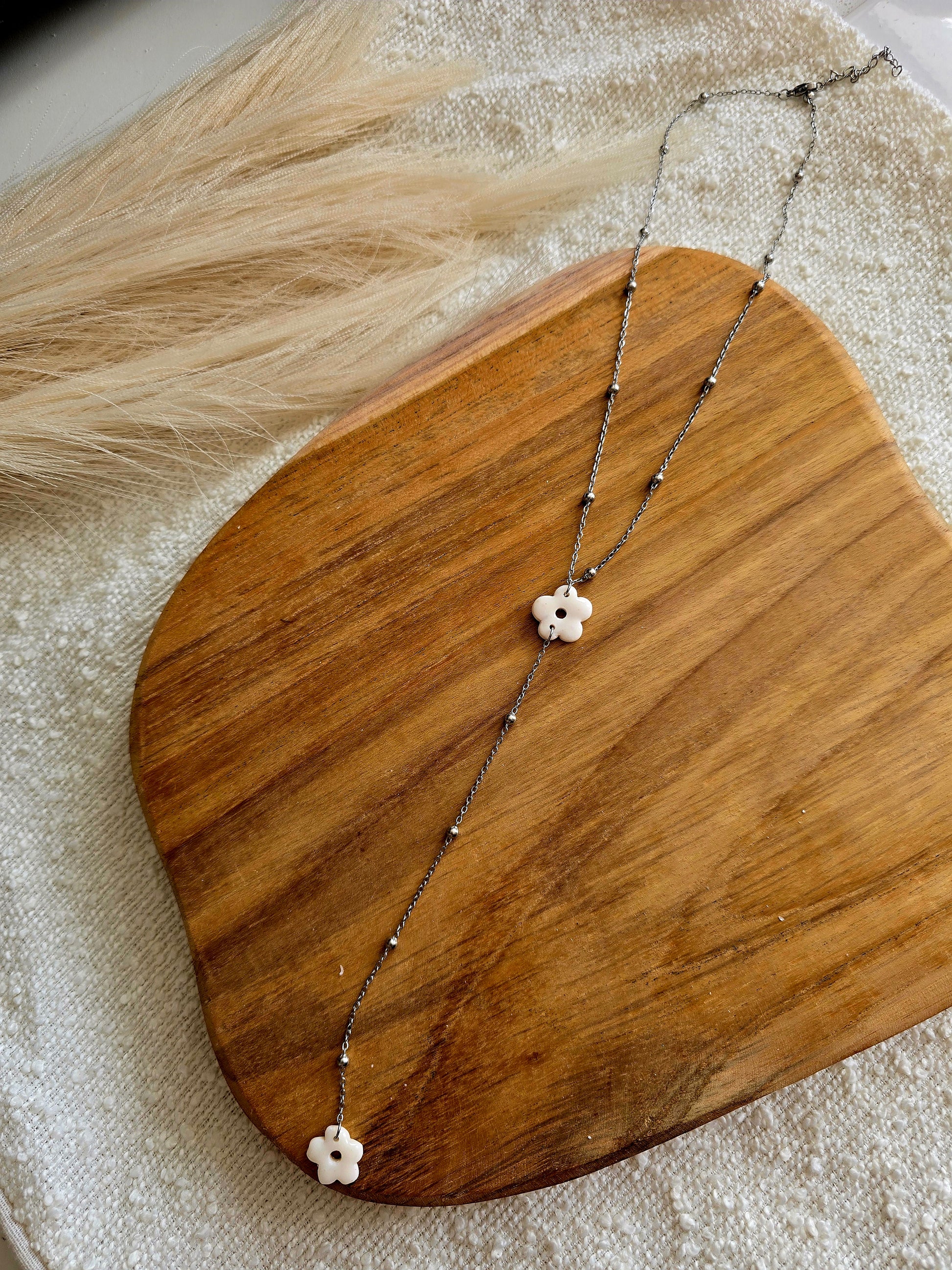 Collier artisanal fabriqué en France. Chaîne et apprêts en acier inoxydable 316L pour une tenue durable au quotidien. Pampille en argile polymère, façonnée à la main puis recouverte de résine UV pour un fini lisse et brillant. Chaque pièce est unique : de légères variations de couleur/motif existent.
